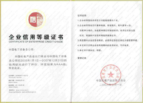 This evolution is an important measure of the China Chamber of Commerce for Import and Export of Machinery and Electronic Products for purpose of promoting a credit system in the field of Machinery and Electronic import and export. This evolution is noted for its high standard, severe criterion and strict procedure. The evolution consists of four aspects: synthetic qualification index, potential management index, competitive index and credit register index. There is three credit levels, including nine classes, of which AAA is the highest level.