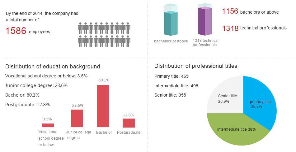 Adhering to the talent philosophy of “display talent through practice, enhancing value by contributions”, the company has cultivated a large number of professionals. By the end of 2014, the company had a total number of 1586 employees, including 1156 bachelors or above and 1318 technical professionals, at portions of 72.9% and 83.1% respectively. The staff team includes a large number of senior technicians such as engineering experts, winners of government subsidies, professor-level senior engineers, national Grade-1 and Grade-2 constructors, registered professional engineers, and design masters. Please refer to the following diagram for the detailed distribution of education background and professional titles.