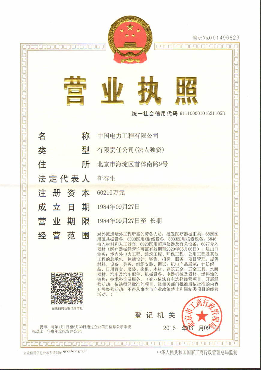 Лицензия на право деятельности Китайской национальной корпорации электроинжиринга