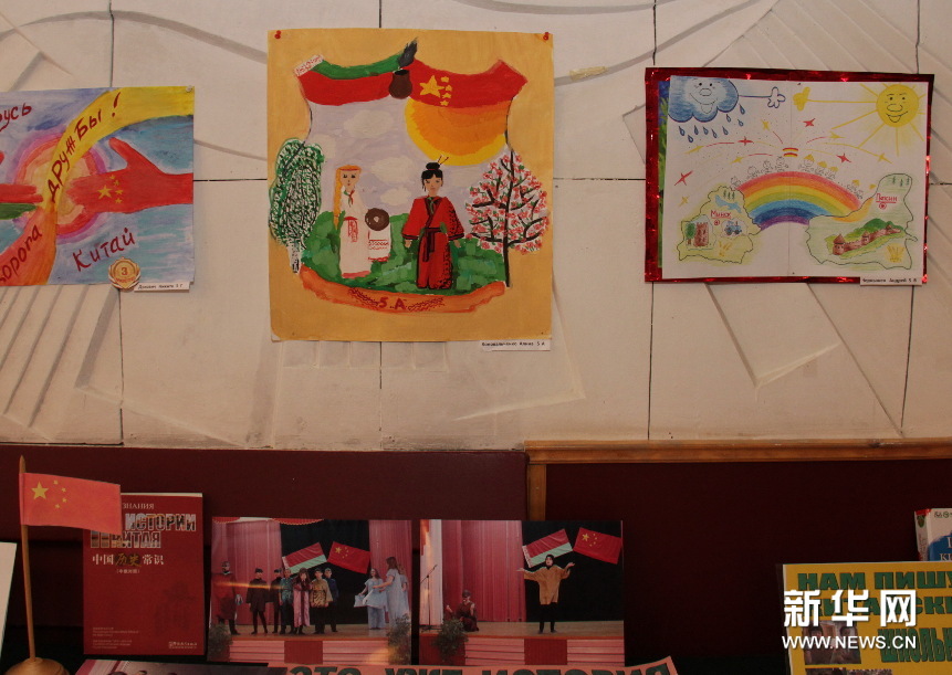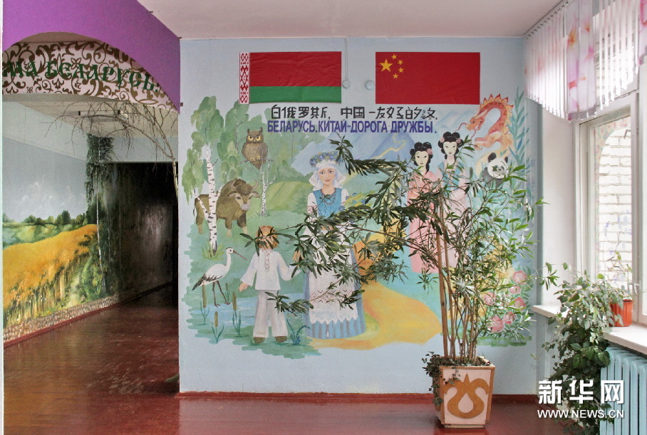 白俄羅斯東北部城市維捷布斯克市的第44學校的走廊,墻壁上繪有老師和同學們一起設計創作的《白俄羅斯,中國-友好的路》壁畫。新華社記者陳俊鋒攝。