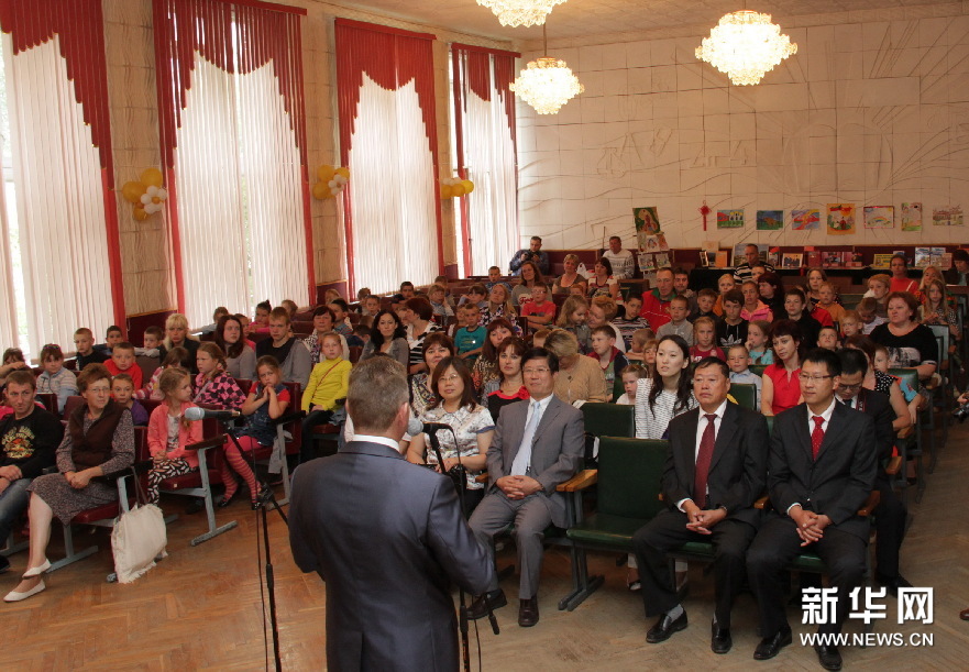 第44學校校長彼塔連科(背對鏡頭者)發言說,沒想到學校受到這樣的關注,連中國駐白俄羅斯大使崔啟明(第一排座位右三)也來了,他感謝中國公司的無私援助。新華社記者陳俊鋒攝。